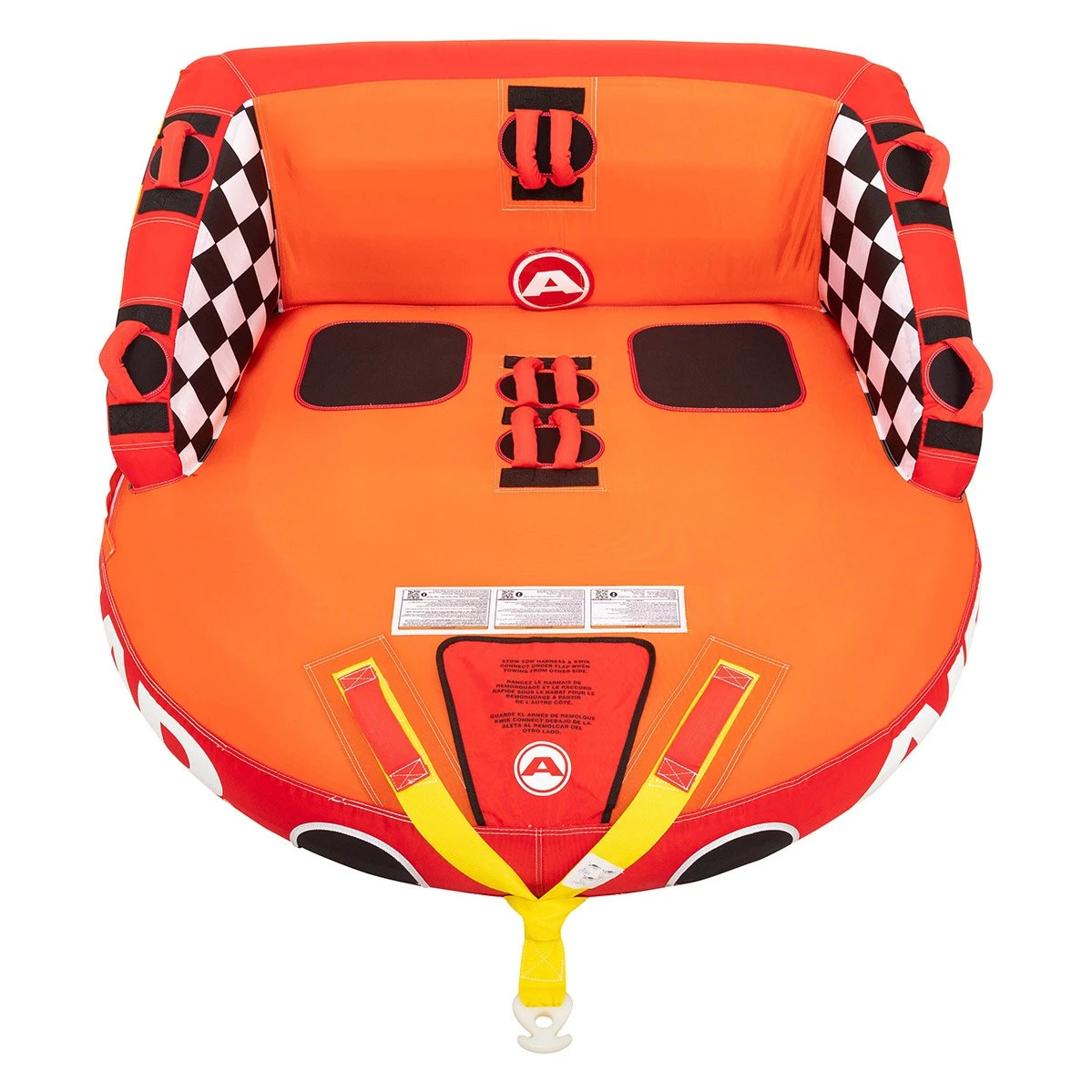 This next generation Mable for 1 to 2 riders has a High Backrest and Air Cushioned Side Walls to keep you on board around every whip and turn. Dual Tow Points allow for 2 completely different riding experiences. Sit, lay, stand, or kneel while towing forwards like a deck tube or backwards like a chariot. Tons of Double Webbing Foam Handles with Knuckle Guards and Foam Seating Pads provide a comfortable ride that will keep you coming back for more. Airhead’s Patented Speed Safety Valve and Kwik-Connect tow point will save you time to keep on the water longer. This uniquely shaped classic towable features a Heavy Gauge PVC Bladder and Double Stitched Full Nylon cover with Custom Graphics. Multi-functional is the Big Mable’s middle name, whether its providing a unique towable riding experience or making the perfect lounge at any pool, beach, lake or river!
